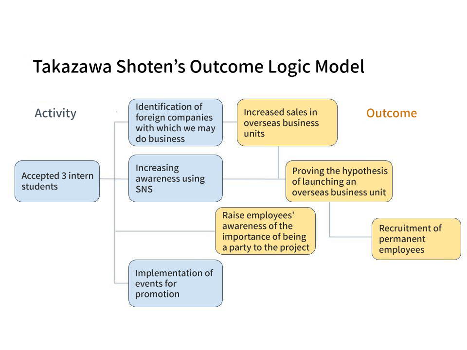 Figure 2 below shows a Logic Model of Takazawa Shoten’s internship project. By accepting 3 interns at the Takazawa Shoten, the company raised employees’ awareness of overseas businesses’ importance. This activity led to the successful recruitment of a permanent employee in charge of the overseas business division.