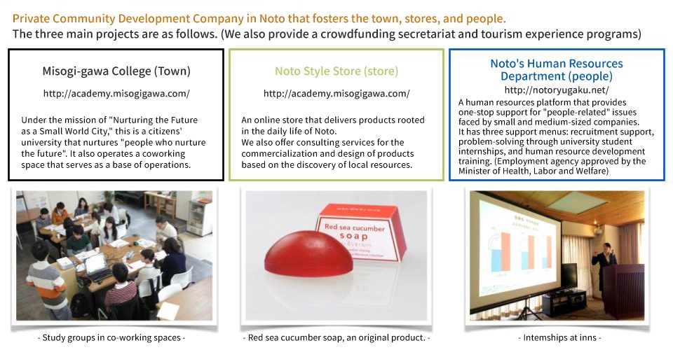 The mission of Misogi-gawa Corporation is to “create a small world city” and build a local sustainable society. To realize our mission in the Noto region, where the population is declining and aging rapidly, Misogi-gawa Corporation strikes to facilitate the circulation of natural resources and local human resources.
