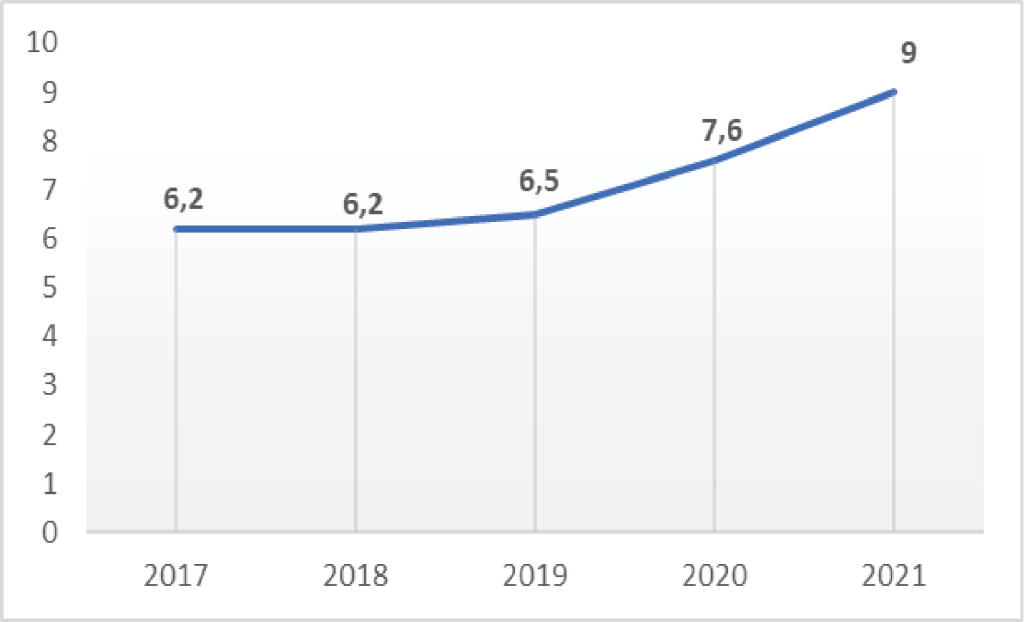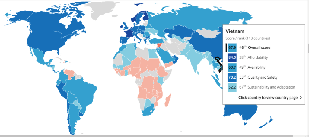 According to the World Food Program’s report (2022), Vietnam’s Global Food Security Index in 2021 stood at 61.1 points, ranking 46th out of 113 countries (Figure 1). This score reflects a decline of 2.2 points compared to 2020, indicative of the adverse impact of climate change on food security. The report underscores: “The decline in Vietnam’s Food Security Index is attributed to the dual impact of the COVID-19 pandemic and challenges posed by climate change, particularly severe droughts and floods in 2021” (see Figure 2).
